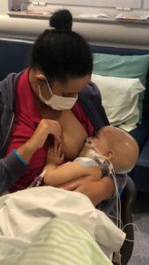 A presença do leite materno na recuperação da Luísa, de 2 anos e 4 meses é fundamental para a sua recuperação. Ela foi diagnosticada com leucemia linfoide aguda (LLA) quando tinha 1 ano e 4 meses, e começou o tratamento. Recentemente precisou passar por uma ECMO (técnica de suporte de vida extracorporal) onde ficou 12 dias no aparelho, 11 na unidade de terapia intensiva (UTI) e, mesmo internada, recebia o leite materno. Assim que foi extubada, voltou a amamentar.