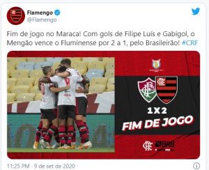 O Flamengo entrou de vez na briga pela liderança do Campeonato Brasileiro após derrotar o Fluminense por 2 a 1 nesta quarta (9) no estádio do Maracanã. Com este resultado, a equipe da Gávea assume a vice-liderança com os mesmos 17 pontos do líder Internacional, que enfrenta o Ceará nesta quinta (10) no Beira Rio.