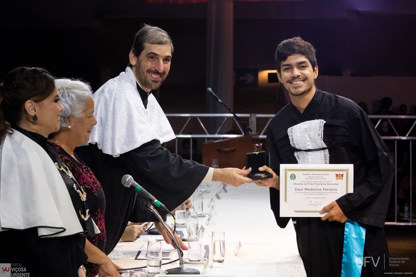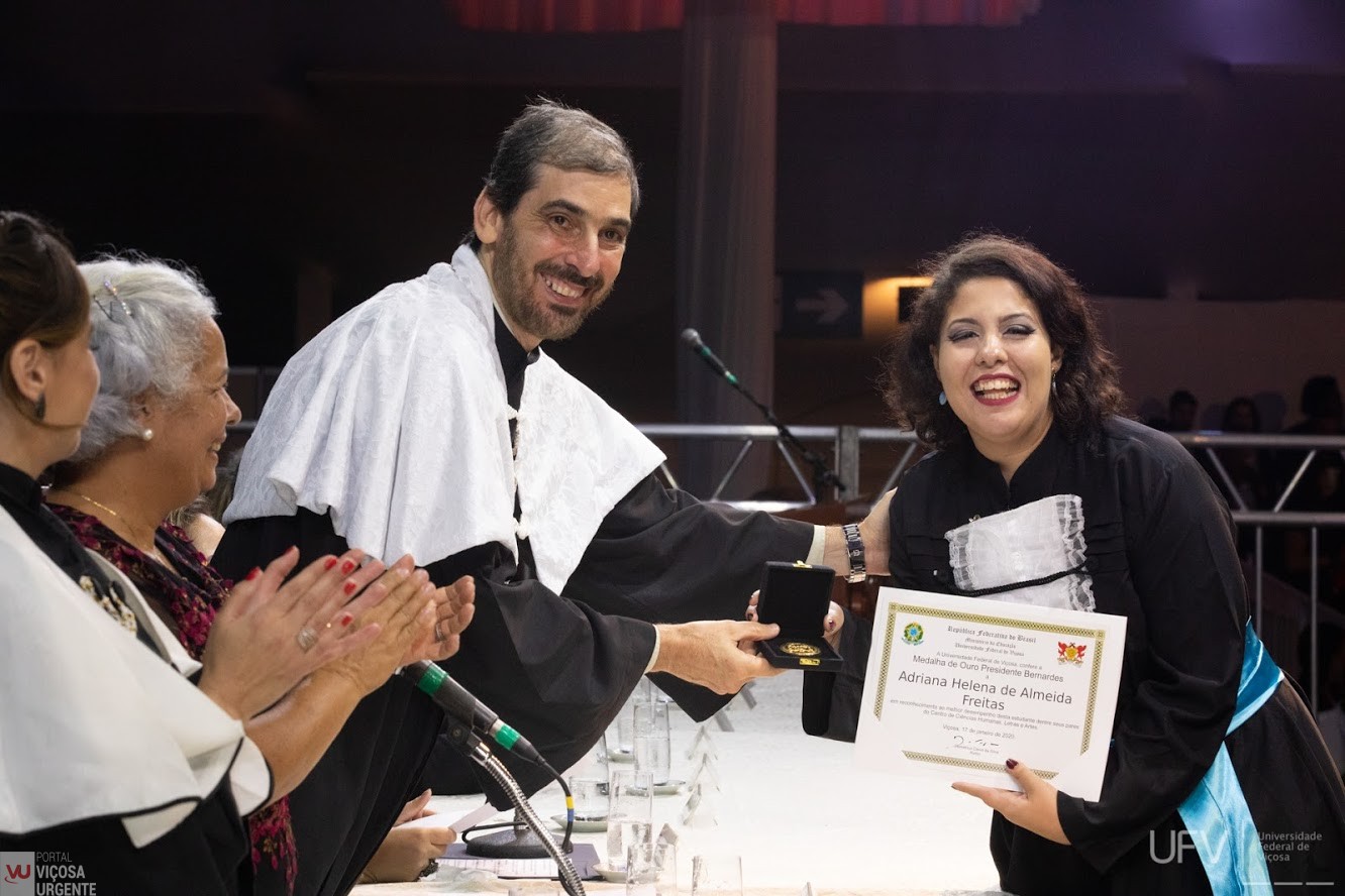 Durante a solenidade de colação de grau dos Centros de Ciências Biológicas e da Saúde (CCB) e Ciências Humanas, Letras e Artes (CCH) da Universidade Federal de Viçosa (UFV), a estudante do Curso de Comunicação Social – Jornalismo, Adriana Helena de Almeida Freitas, recebeu a Medalha de Ouro Presidente Bernardes, por ter o maior coeficiente entre todos os acadêmicos dos cursos vinculados ao Centro de Ciências Humanas. Somente um(a) estudante de cada Centro recebeu a medalha, conforme Resolução 10/2009 do Conselho Universitário (CONSU). No evento, ocorrido na noite da última sexta-feira (17), outro estudante do Curso foi homenageado. Davi Medeiros Ferreira recebeu medalha de prata. Antes, pela manhã do mesmo dia, Antônio Carlos Vieira havia recebido uma menção honrosa pelo seu desempenho acadêmico durante a graduação em Comunicação.