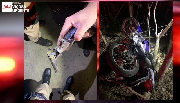 Após caírem ao solo, os indivíduos evadiram em direção a uma mata, próximo a motocicleta caída, os Policiais Militares encontraram uma garrucha calibre ,38, com 02 munições e o celular da vítima.