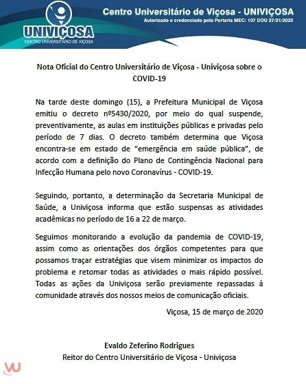 Em prevenção ao coronavírus Univiçosa suspende atividades acadêmicas Publicado em 16 de março de 2020 . Compatilhe esta publicação: Twitter Facebook Google+