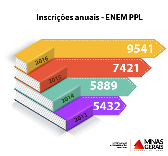 Uma chance de alcançar novas conquistas e oportunidades. É o que almejam os 9,5 mil detentos que irão realizar o Exame Nacional do Ensino Médio para Pessoas Privadas de Liberdade (Enem PPL), nesta terça e quarta-feira (13 e 14/12), em Minas Gerais. A marca representa um aumento de 25% em relação a 2015. Com a segunda maior população carcerária do Brasil, o estado mantém a mesma posição em número de inscritos para o Enem PPL, respondendo por 18% do total de inscrições nacionais.