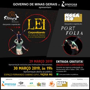 A cidade de Viçosa, localizada na região da Zona da Mata Mineira, recebe nos dias 29 e 30/03 o espetáculo “LEI”, que tem como temática às 3 Leis de Newton e a Lei Gravitacional, traçando um paralelo entre as Leis da Física Clássica e Leis criadas pelo Homem para regular conflitos da vida em sociedade, refletindo na influencia direta das leis em nossas vidas e movimentos dos corpos no cotidiano. A apresentação do espetáculo é um evento em parceira com a Companhia Mosaico de Dança Contemporânea de Viçosa, que também apresentará o trabalho “PORTFOLIA”.