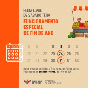 A tradicional feira livre de sábado terá uma programação especial para o final de ano. Nas semanas do natal e do ano novo, a estrutura para os feirantes e consumidores será montada às quintas-feiras, dias 24 e 31.