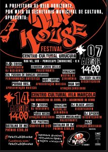 Nos dias 07 e 14 de abril, de 14h às 21h, no Centro Cultural Urucuia, no Barreiro e Centro Cultural Vila Marçola, no Aglomerado da Serra, respectivamente, jovens produtores culturais promoverão a primeira edição FESTIVAL HIP HOUSE da cidade.