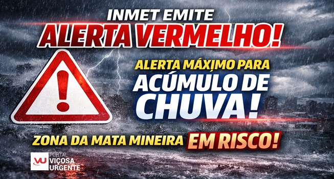 O Instituto Nacional de Meteorologia (Inmet) emitiu nesta terça-feira (24) um Alerta Vermelho de grande perigo para acumulado de chuva em Minas Gerais. O aviso começou às 9h45 e permanece válido até as 23h59 de quinta-feira (27). Segundo o órgão, há previsão de volumes superiores a 60 milímetros por hora ou acima de 100 milímetros em um único dia, cenário que representa alto risco de impactos à população, principalmente em áreas urbanas e regiões de encosta.