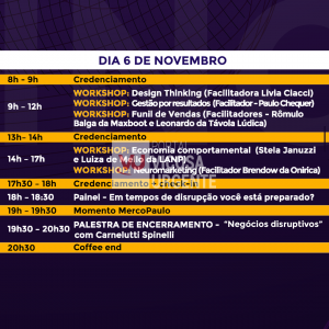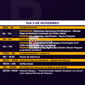 As inscrições vão até 4 de novembro e devem ser realizadas pelo site da Fundação Arthur Bernardes, onde também está disponível a programação. Para abordar o tema Em tempos de disrupção você está preparado?, o evento contará com debates sobre empreendedorismo, marketing digital, liderança, gestão por resultados, transformação digital, negócios disruptivos, investimentos e neuromarketing.