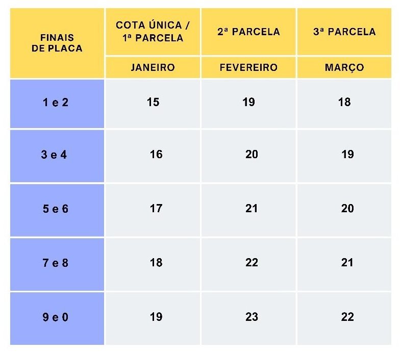 Os pagamentos do IPVA 2024 começarão para veículos com finais de placas 1 e 2, estendendo-se até 22 de março de 2024 para a quitação da terceira parcela dos veículos com finais de placas 9 e 0.
