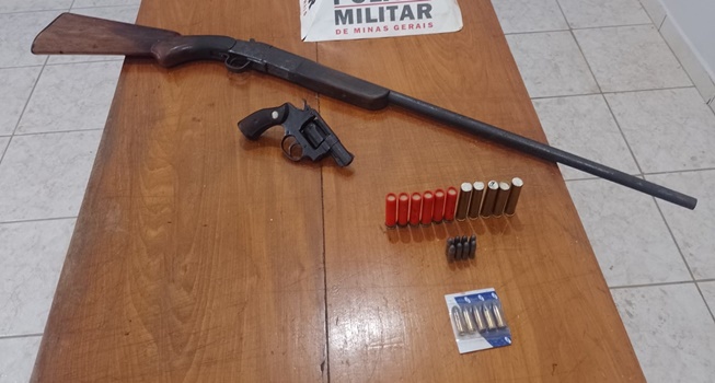 Diante do observado, os militares deslocaram até o local onde observaram o morador arremessar os objetos e encontraram um revólver calibre .32 municiado com cinco munições e uma espingarda do mesmo calibre, carregada com um cartucho.