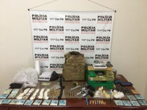 Na segunda residência: 01 colete balístico camuflado com placa; 01 empunhadura para revólver de borracha; 01 balança de precisão; 01 balança de precisão de mão; 04 celulares; 03 rolos de fita; 01 caderno com anotações; 03 CRLV’s; 01 rolo de papel filme; R$ 6.685,00 reais; 04 munições .38; 06 munições calibre .22; 11 Tabletes de substância análoga à maconha; 07 porções de substância análoga a cocaína; 06 porções de substância análoga à maconha; e 16 pinos de substância análoga à cocaína.