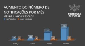 Em Junho foram registrados 38 casos positivos de Covid-19 em Viçosa. Nesse período, a Secretaria de Saúde intensificou as ações para detectar a presença do vírus no município. Mais da metade de todas as notificações realizadas desde o início da pandemia foram feitas no mês passado. De março a junho, a Vigilância Epidemiológica tinha recebido 2174 notificações, sendo 1206 somente no último mês. Isso representa 55,4% do total.