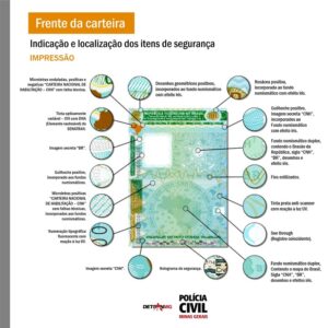 O documento também apresenta padrões de segurança contra falsificações, como o mapa do Brasil impresso com tinta de variação óptica, com DNA (elemento rastreável) da Secretaria Nacional de Trânsito (Senatran). Entre os itens de segurança também estão as imagens secretas, hologramas e impressões reativas a luz ultravioleta.