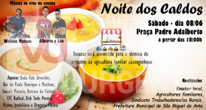 Prefeitura Municipal de São Miguel do Anta, Emater Local, Sindicato dos Trabalhadores e Trabalhadoras Rurais de São Miguel do Anta e agricultores (a) familiares do município convidam a todos para a “Noite dos Caldos” que será realizada neste sábado (08/06), a partir das 18:00h, na Praça Padre Adalberto (São Miguel do Anta).