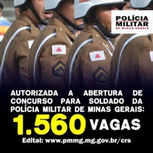 A Polícia Militar de Minas Gerais (PMMG), por meio da sua Diretoria de Recursos Humanos, já está divulgando o concurso público para o provimento de 1.560 cargos de soldados no primeiro semestre de 2019.
