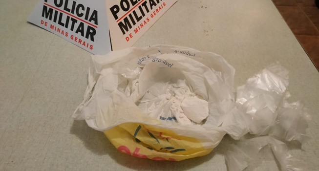 Entretanto, após uma busca minuciosa no automóvel, foi localizado debaixo do banco do carona, uma sacola com uma porção de cocaína e saquinhos usados, comumente para embalar droga.
