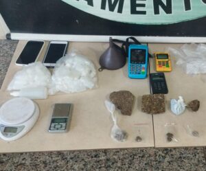 Os militares deslocaram-se até a residência do suspeito e flagraram dois indivíduos realizando movimentações típicas de entrega e recebimento de entorpecentes. Ao perceberem a presença da viatura, tentaram fugir, mas um deles foi alcançado e detido. Durante a tentativa de fuga, o suspeito descartou uma sacola contendo oito pinos cheios de cocaína, tabletes e buchas de maconha.