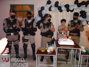 Fardado e com direito a festa com o tema da PMMG, um menino morador de Viçosa, realizou seu sonho em receber os militares da 10° Cia PMMG em sua festa de aniversário, para a emoção de seus familiares. O convite partiu de sua mãe que amou a presença dos policiais na festinha.