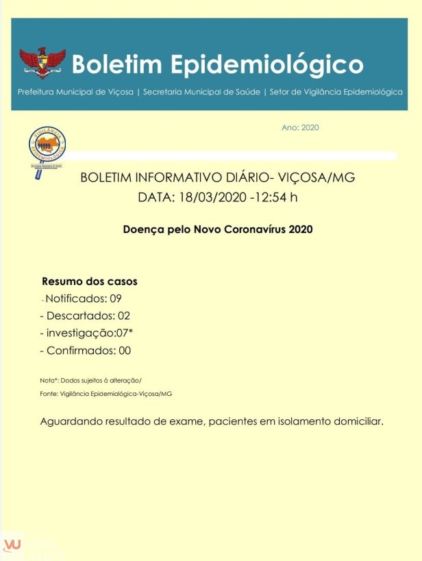 Prefeitura confirma sete casos suspeitos de Coronavírus em Viçosa Publicado em 18 de março de 2020 . Compatilhe esta publicação: Twitter Facebook Google+ BOLETIM CORONAVIRUS 5