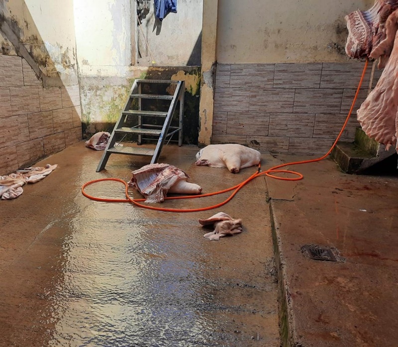 Durante as buscas, foram apreendidos duas carcaças de animais suínos que estavam sendo manuseadas no momento da chegada dos policiais civis, além de carnes e linguiças acauteladas em freezers e câmaras frias que podem ultrapassar o peso de uma tonelada. As carnes eram distribuídas para restaurantes e açougues da região. Apurações indicaram que o suspeito dispensava os resíduos sólidos e líquidos no meio ambiente, sem o devido tratamento e destinação.