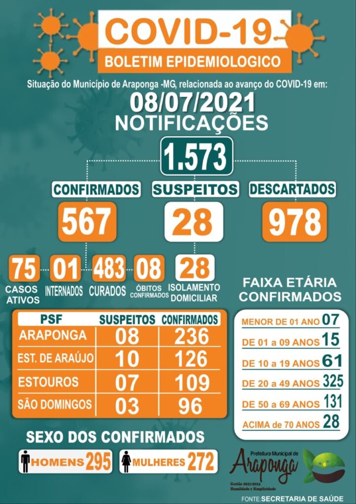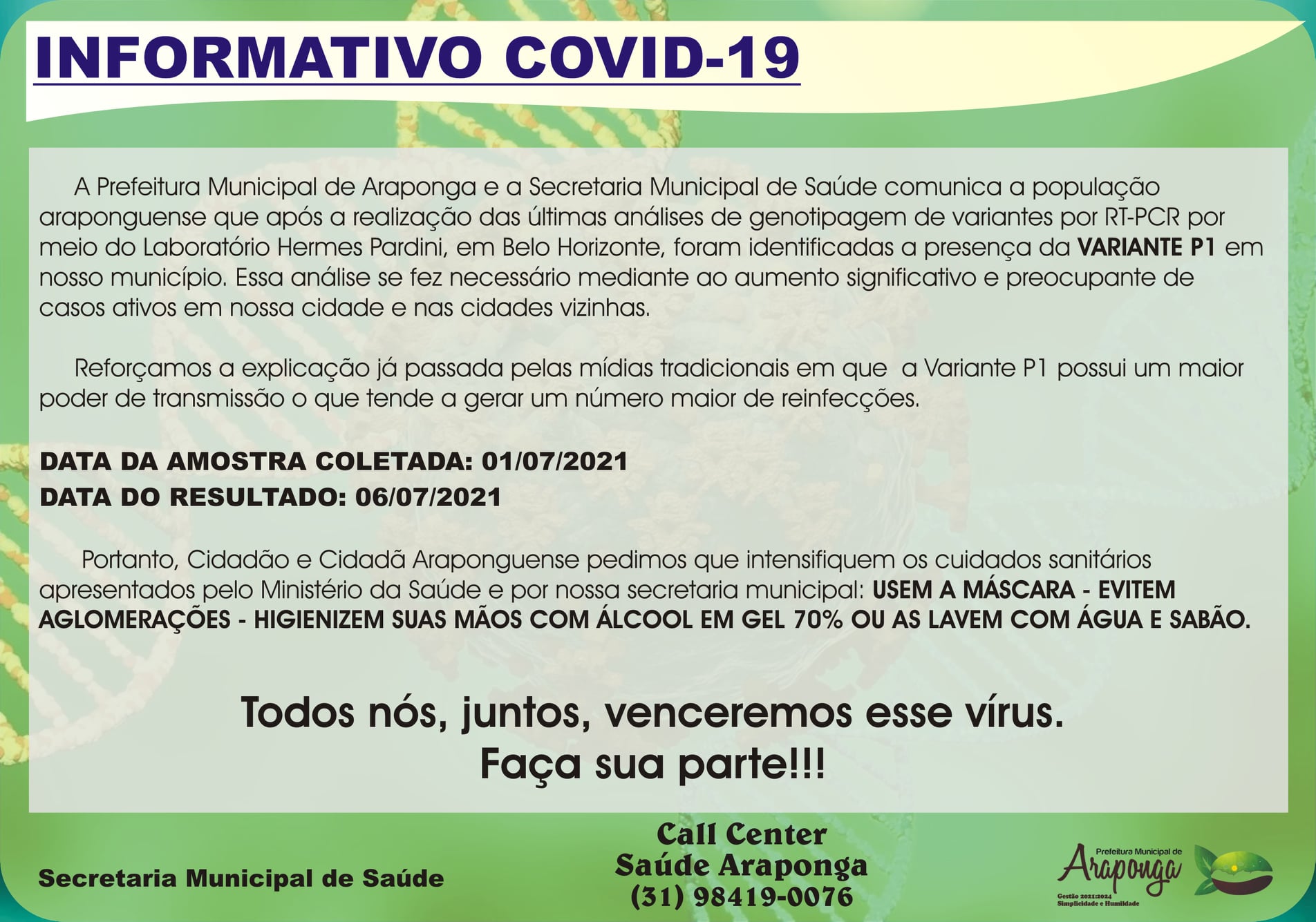 A prefeitura municipal de Araponga por intermédio da secretaria municipal de saúde, divulgou um comunicado na data de hoje 08/07, informando que ultimas análises, realizadas pelo laboratório Hermes Pardini, em Belo Horizonte constataram a presença da variante P1, do covid-19 no município.