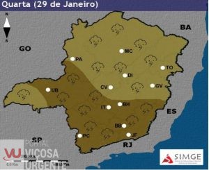 A ZCAS (Zona de Convergência do Atlântico Sul) entra em estágio de dissipação, mas ainda deverá provocar acumulados significativos na porção centro/sul do estado. A previsão é de tempo instável em todo o estado, com tempestades severas com potencial para granizo, na porção leste/sudeste do estado, entre o Vale do Mucuri e o Sul de Minas. Já entre o Triângulo Mineiro, Oeste do Sul de Minas, Central e Oeste, centro/sul da Metropolitana, Campo das Vertentes e Zona da Mata, nessas regiões as tempestades poderão gerar altos acumulados de chuva, que podem chegar a marca dos 100mm em curto período de tempo e vendaval.