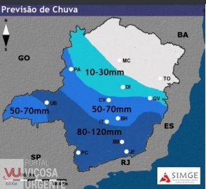 Já entre o Triângulo Mineiro, Oeste do Sul de Minas, Central e Oeste, centro/sul da Metropolitana, Campo das Vertentes e Zona da Mata, nessas regiões as tempestades poderão gerar altos acumulados de chuva, que podem chegar a marca dos 100mm em curto período de tempo e vendaval. A porção Norte do estado, entre o Noroeste, Norte e Vale do Jequitinhonha, tempestades isoladas a tarde, sem acumulados significativos. Belo Horizonte, tem previsão de tempo instável, com variação da nebulosidade e tempestades acompanhadas de raios, ventos fortes e com tendência para provocar enxurrada.