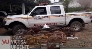 Em atendimento a denúncia anônima de cativeiro irregular de pássaros da fauna silvestre, militares do 2º Gp/2ºPel MAmb em Viçosa, deslocaram para a averiguação e após obterem franquia para fiscalização, por parte do autor, localizaram 26 (vinte e seis) pássaros, sendo que 07 (sete) não possuíam anilhas e 19 (dezenove) estavam anilhados.