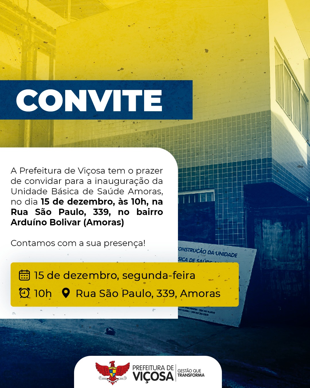 A Prefeitura de Viçosa, por meio das secretarias municipais de Saúde e de Governo, inaugura na próxima segunda-feira (15), às 10 horas, uma nova Unidade Básica de Saúde localizada na Rua São Paulo, nº 339, no bairro Arduíno Bolivar, conhecido como Amoras.